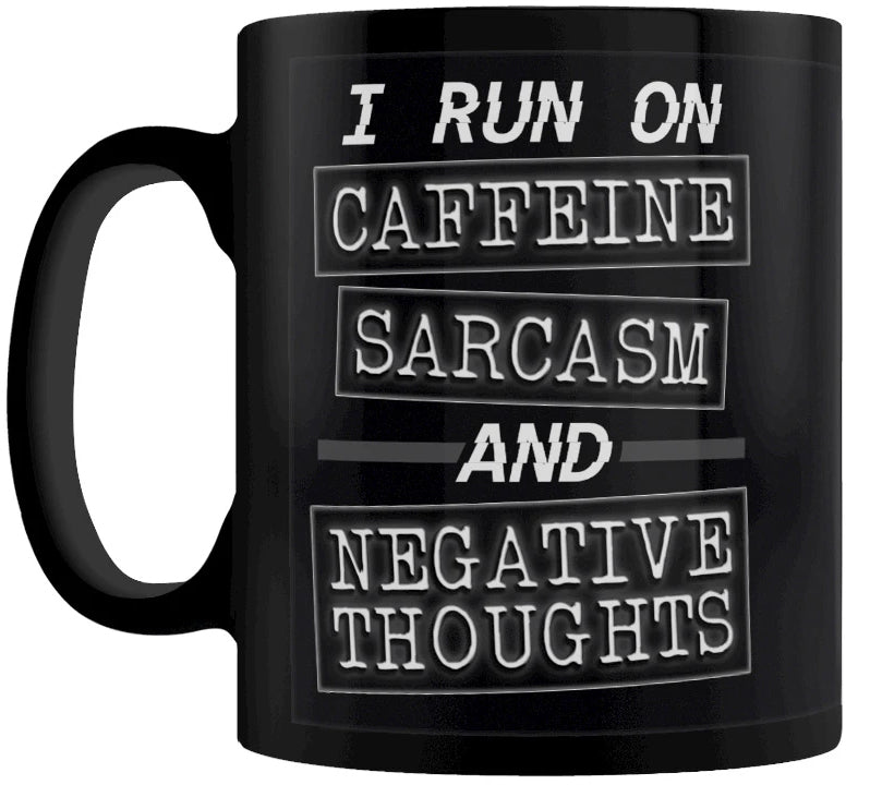 Je cours à la caféine, au sarcasme et aux pensées négatives Mug noir