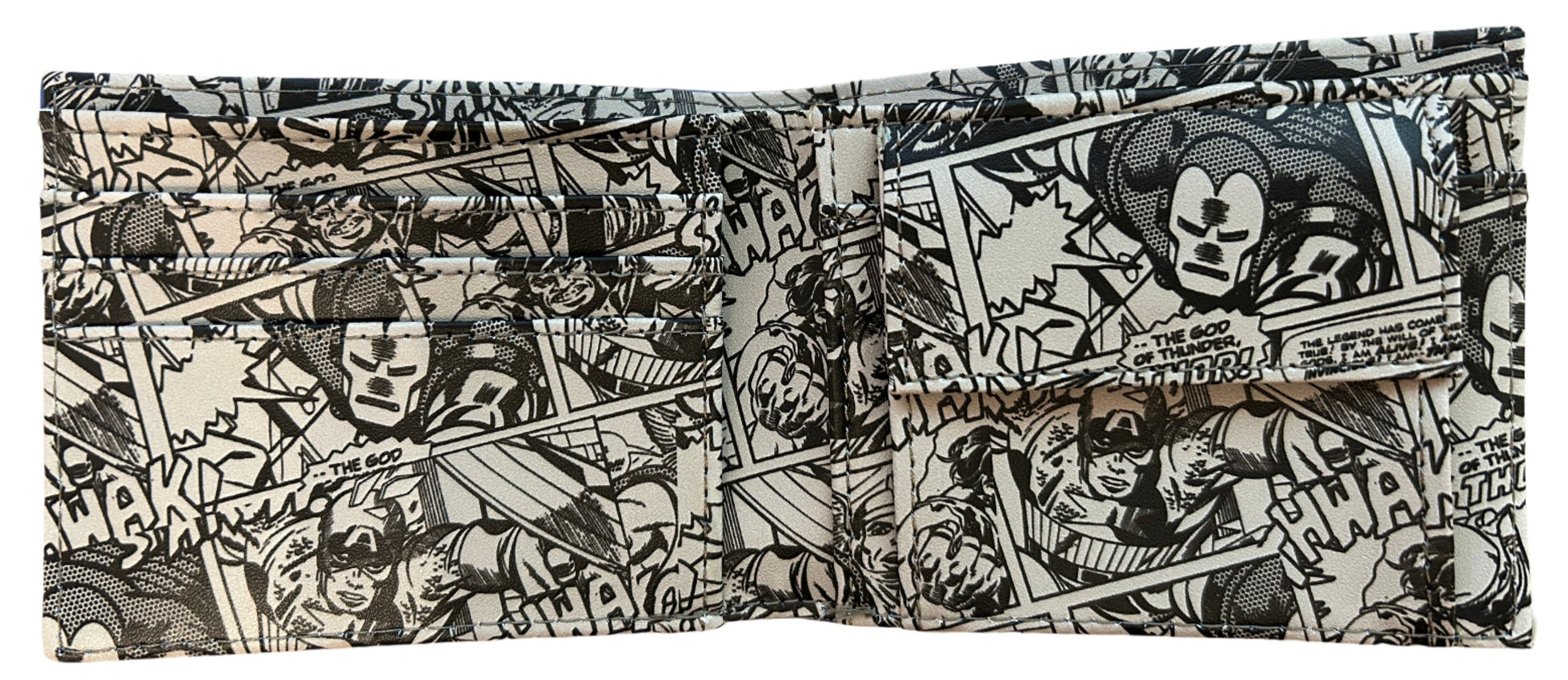 Carry your essentials like a true hero with this Captain America Bifold Wallet! Featuring a nostalgic comic-strip lining, this wallet is a must-have for fans of the First Avenger.