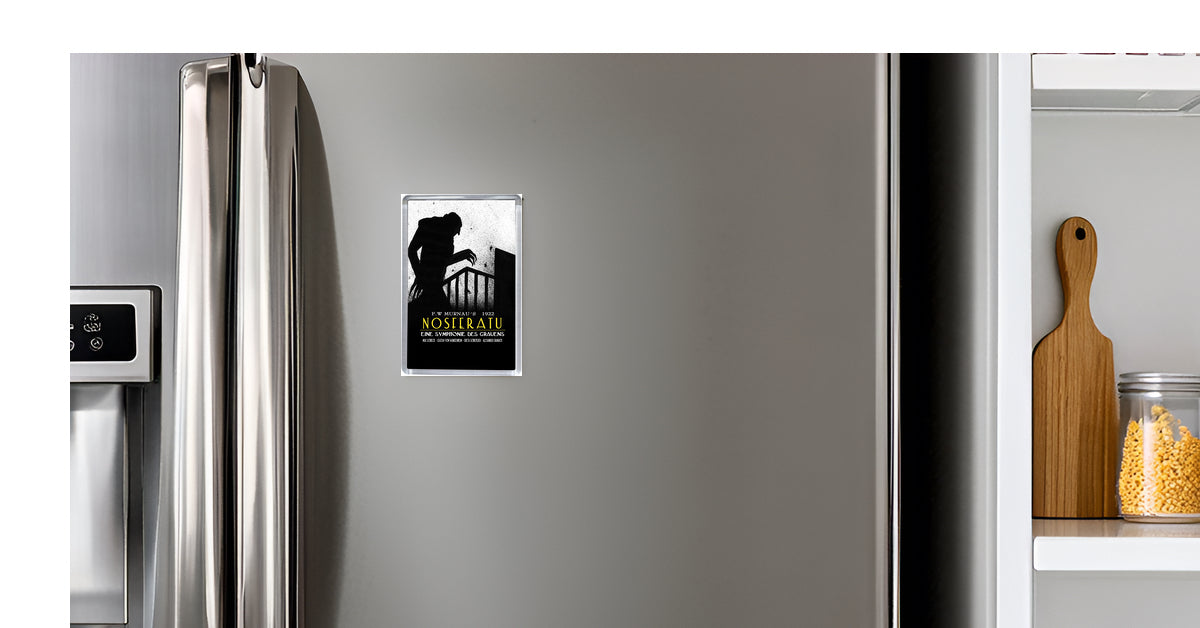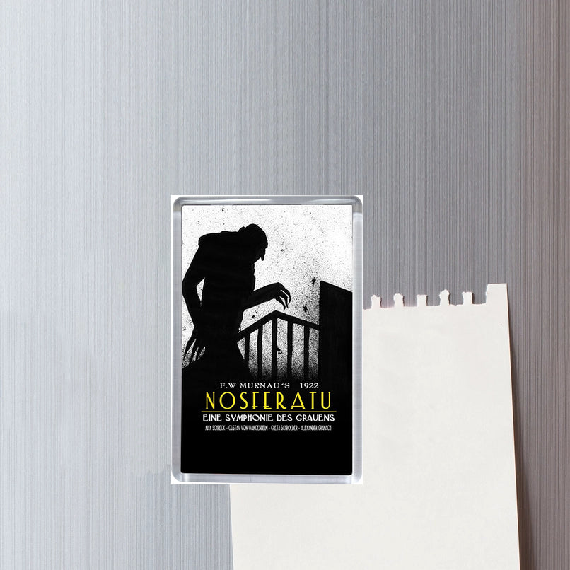 Bring vintage horror to your kitchen with this Nosferatu Shadow Classic Movie Poster Fridge Magnet. Featuring the chilling silhouette from the iconic 1922 silent film, this magnet is a must-have for fans of gothic cinema. Professionally printed on high-quality photographic paper and encased in durable acrylic, it offers vivid, long-lasting colour and a strong magnetic hold.