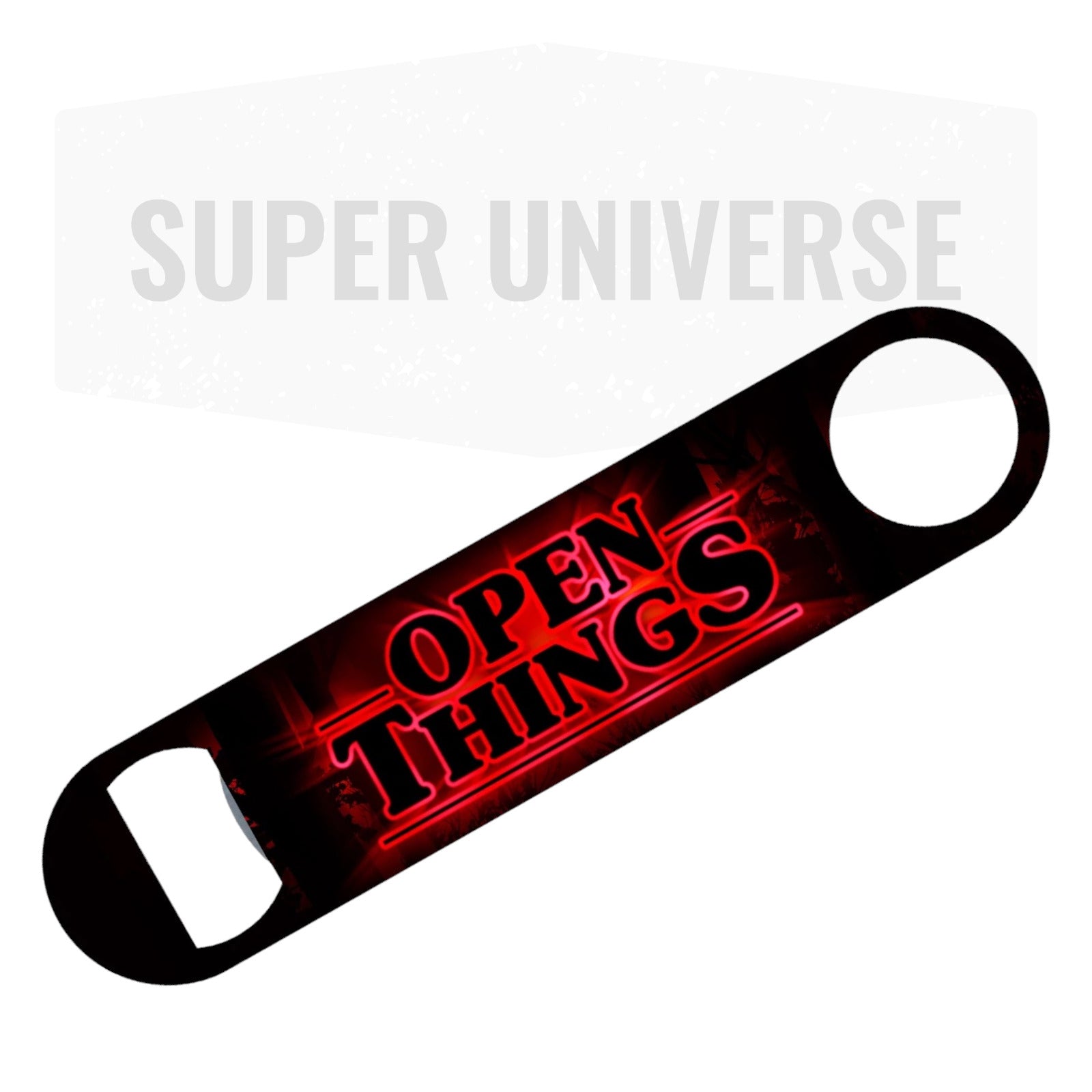 Inspired by the iconic Stranger Things font, the "Open Things" bar blade bottle opener brings a fun, retro vibe to your drink time. Perfect for fans of the show and practical for any kitchen or bar.