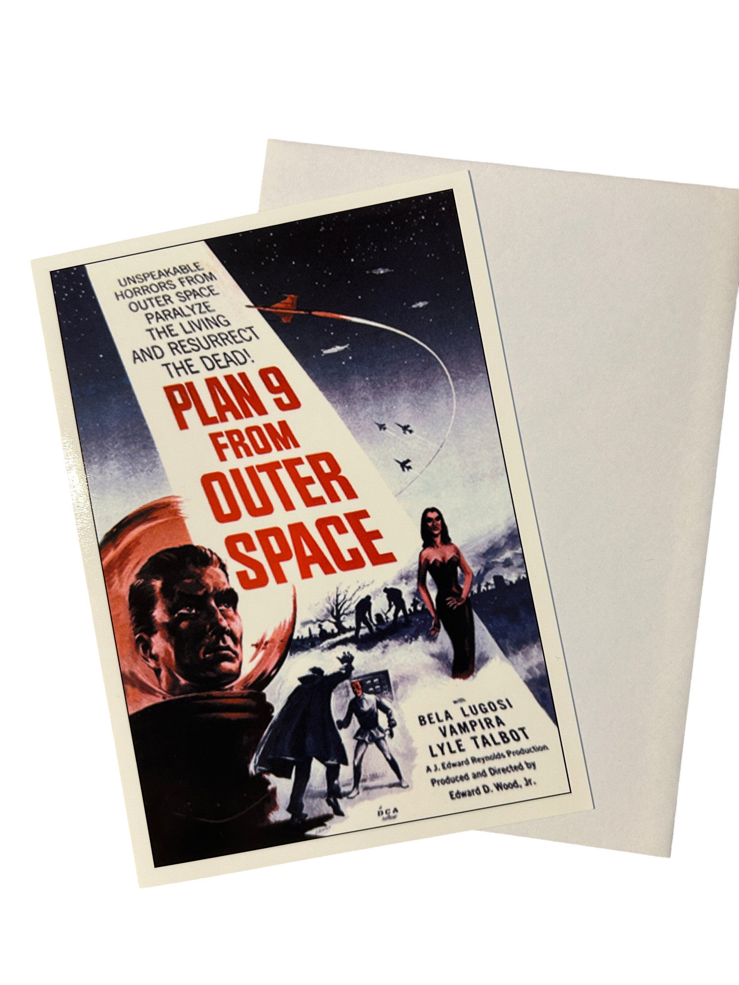 Celebrate the quirky charm of classic sci-fi with this Plan 9 From Outer Space Greeting Card! Perfect for film buffs or anyone who loves vintage cinema.