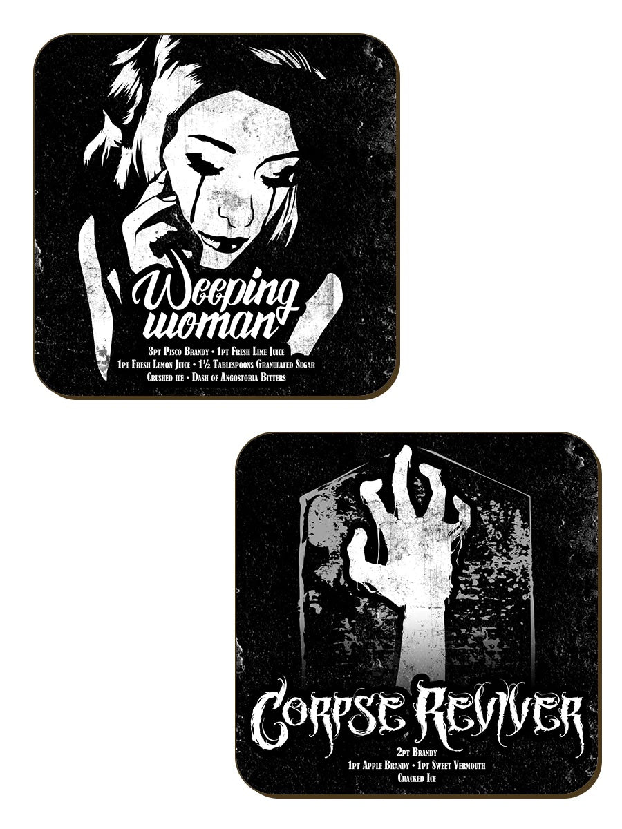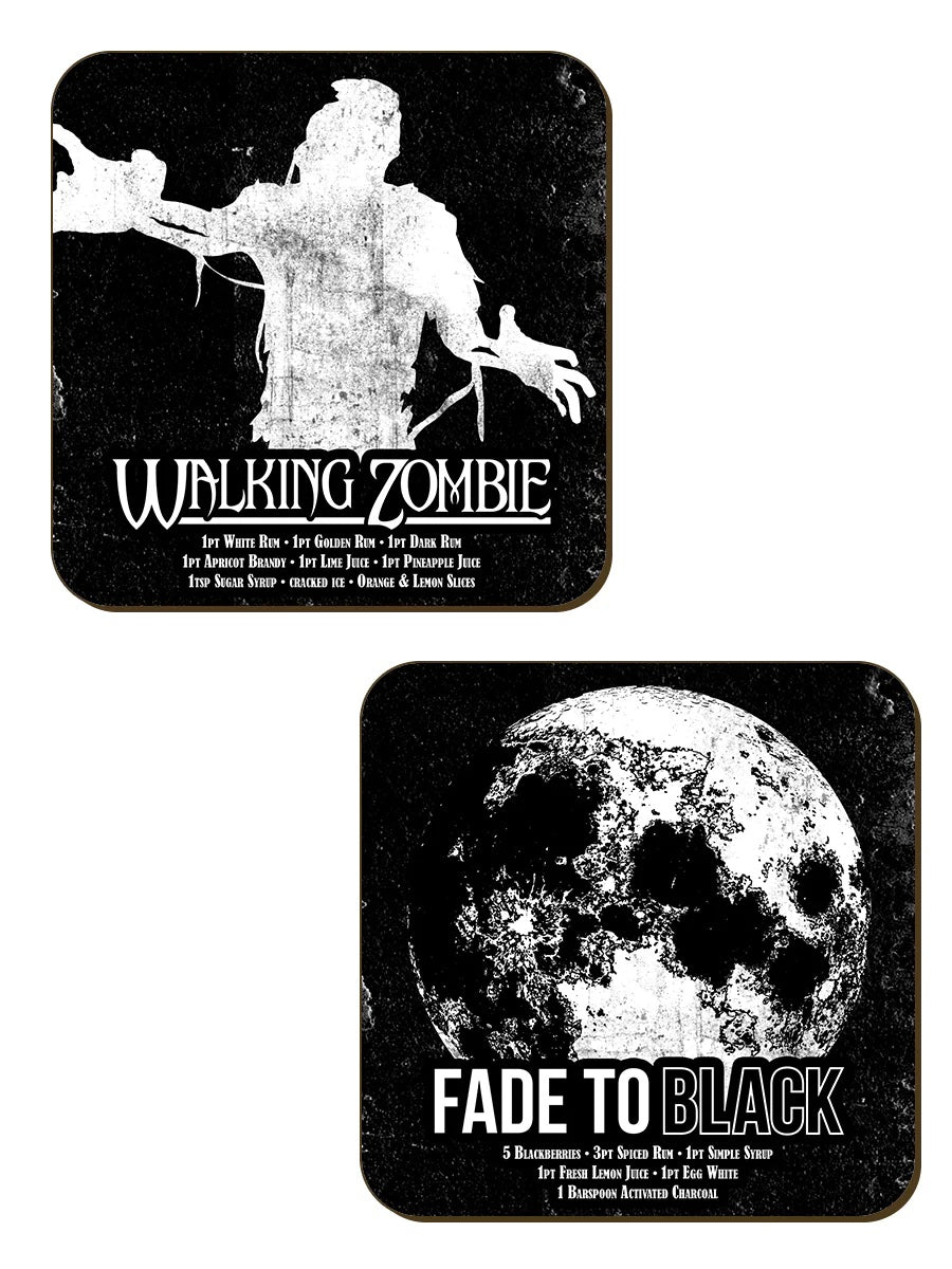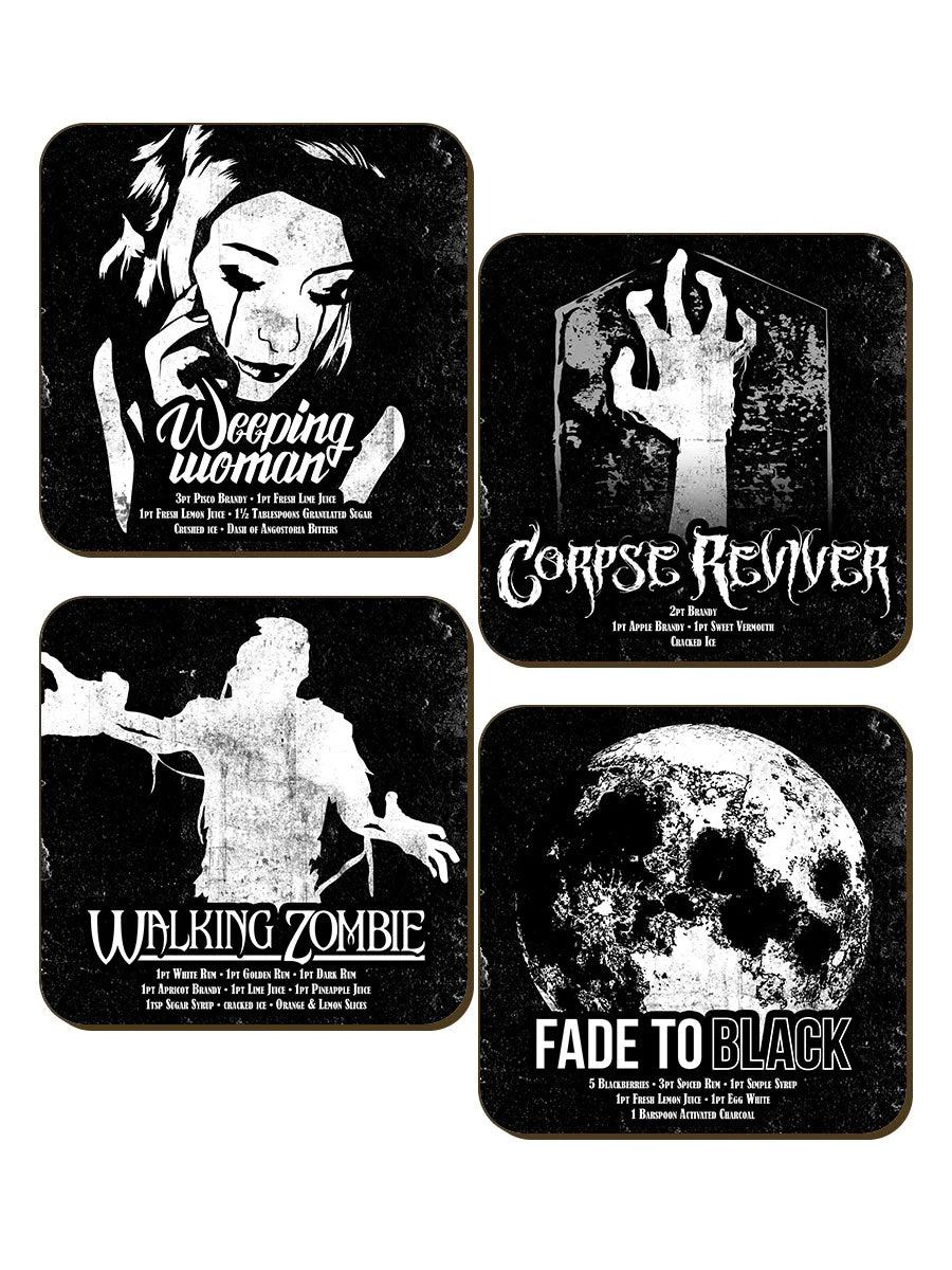 🍹 Set of 4 Unique Coasters – Each with a different creepy cocktail recipe and illustration.