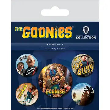 Celebrate the timeless adventure of The Goonies with this iconic Set of 5 Pin Badges, perfect for fans of the classic movie.