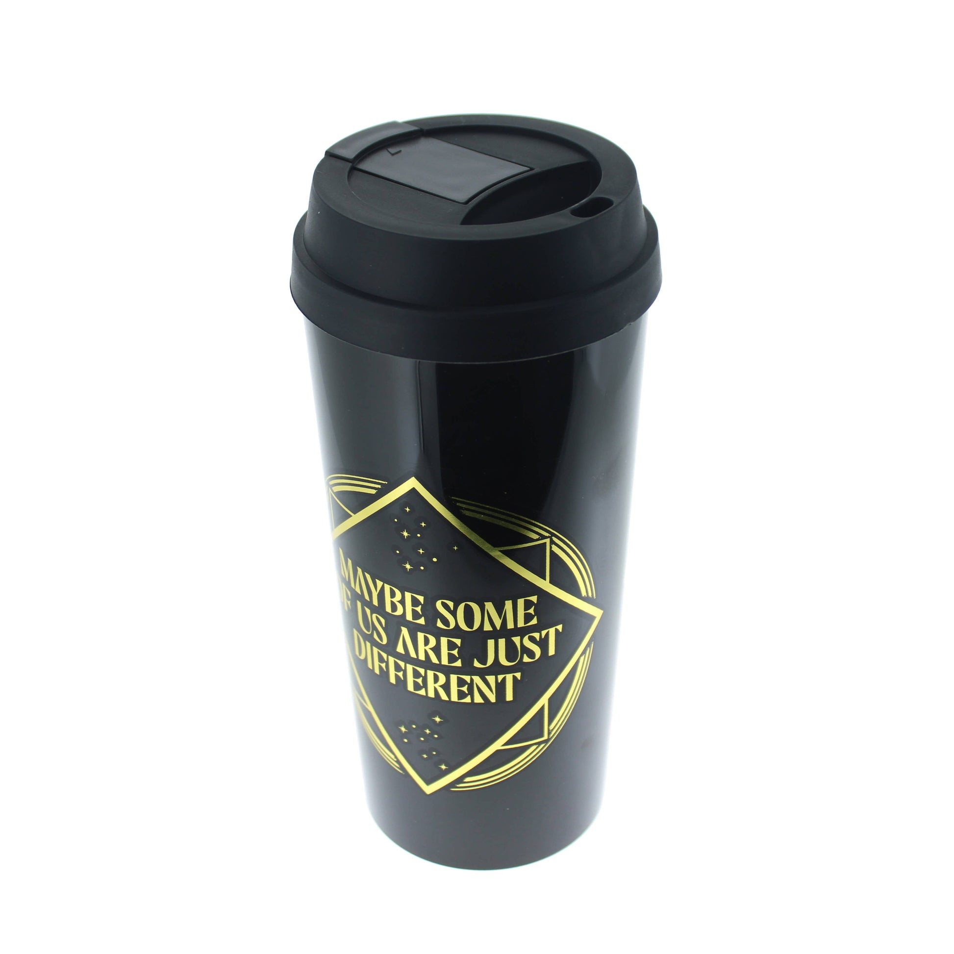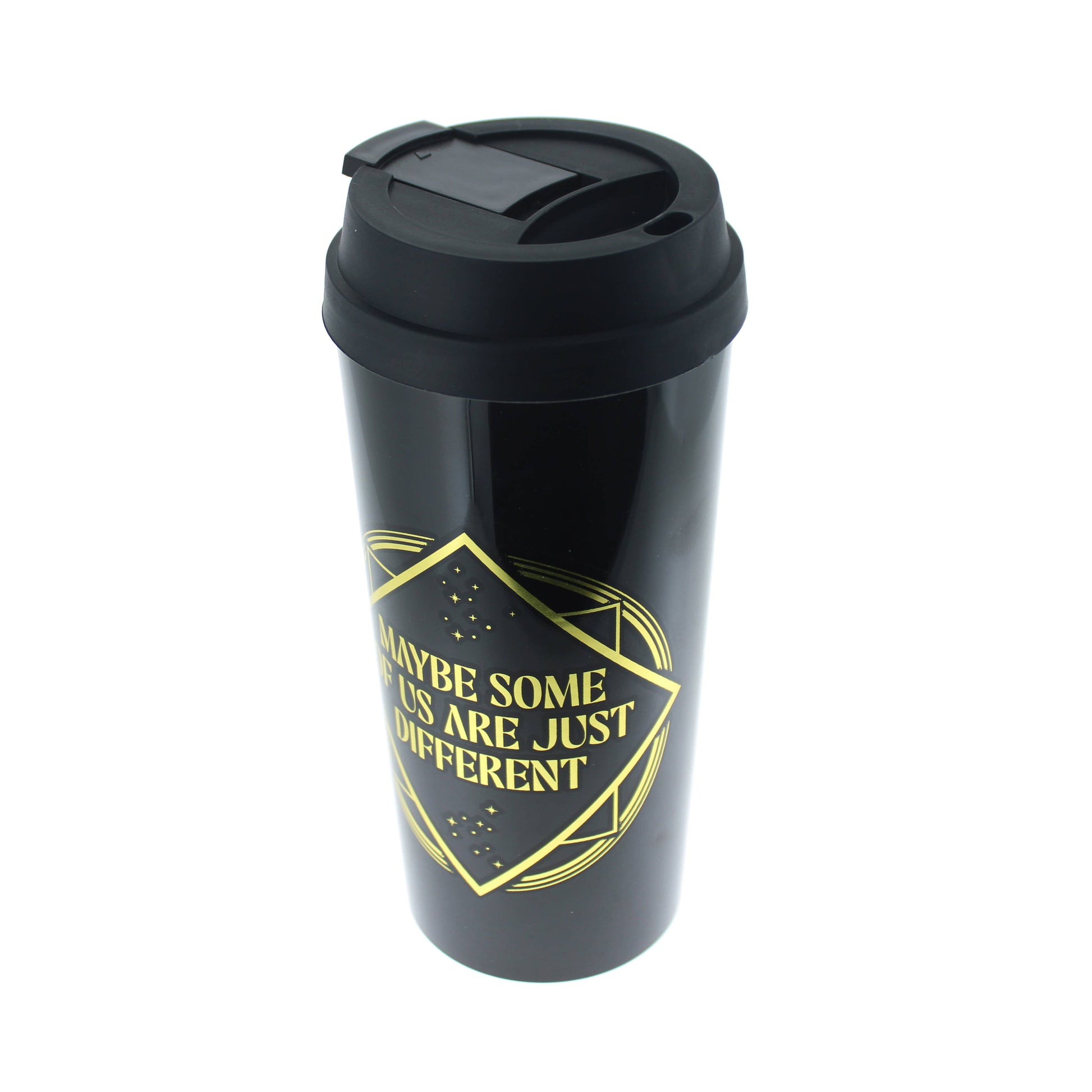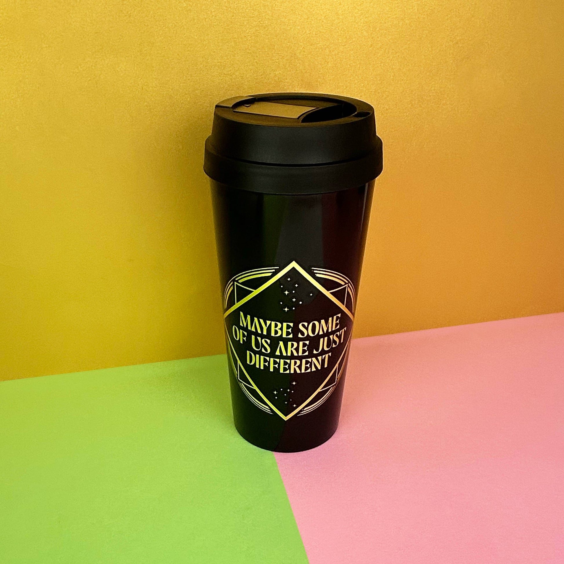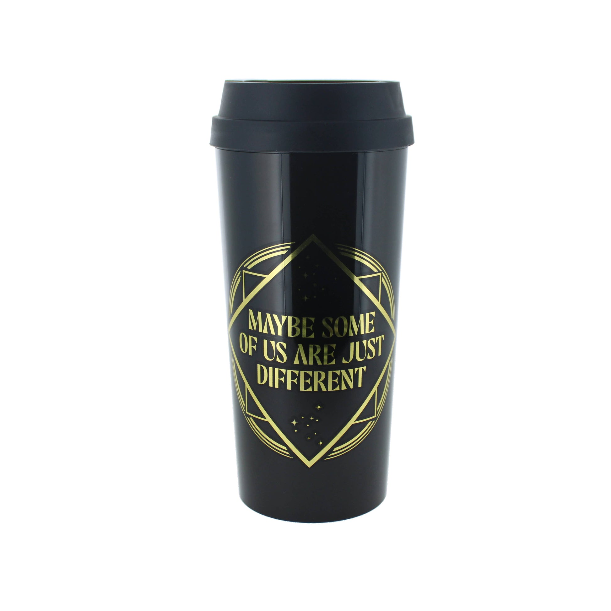 Take your favorite hot drinks on the go with this Wicked-inspired travel mug! Designed for fans of the iconic musical, this sleek black mug features a gold foil design on both sides—one showcasing the Wicked logo and the other with the inspiring words: "Maybe some of us are just different."